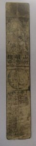 一冊のクリアファイルブックに収められていた藩札類は、明治初期の紙幣まで含めると83枚ありました。学芸員の許可を得てスナップ写真を持ち帰り、日本で整理・同定をしたところ、いわゆる藩札類は68枚で、太政官札や明治になって発行された為替会社や開拓使兌換証券などが15枚含まれていました。各藩が領国内で使用することを前提に発行された藩札類は、北は秋田・仙台から南は福岡・佐賀までそれぞれの枚数は少ないながらも網羅されており、安政元年(1854)の山田羽書も1枚含まれていました。山田羽書は日本最古の紙幣であり、1610年頃には発行され、7年に一度改札がおこなわれる信用力のある私札なのです。おそらくこれらは、キヨッソーネが近代日本紙幣のデザインを考える上で参考にしたのではないかと思います。彼の代表的な仕事は、神功皇后像や大黒像をデザインした横型の紙幣を製作しており、美術館内にもその説明板があります。