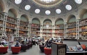 一般的には、古貨幣資料は博物館に収蔵されているのですが、ここのように図書館が所蔵している場合もあるのです。従って、私にとってこれからの2年間は、パリが研究の中心地となります。写真のように、この図書館は格式のある大きな円形ドームの壁に書籍がぎっしりと配架されており、来館者がゆったりと大きなソファーに座って勉強している姿を見ると、日本の図書館とはずいぶん違う雰囲気だなと感じます。この建物内にはいくつもの研究室があり、様々な分野の研究者たちが活動しているのです。浮世絵はもっとも代表的な日本のコレクションでしょう。しかしながら、日本貨幣の専門家はいないため、私のような日本人研究者が訪れて研究の支援をすることは歓迎されるのです。日本の貨幣を研究しているからこそ、海外の研究にコミットできるのです。
